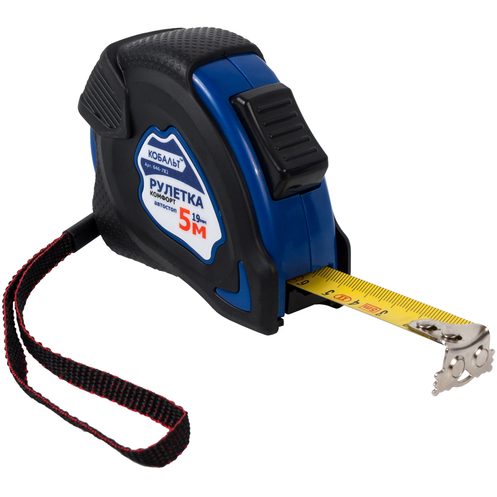 Рулетка Комфорт (5м x 19мм) КОБАЛЬТ 646-782 используется при ремонтных работах. Спроектированная конструкция корпуса обеспечивает комфортабельность во время работы, тем самым рулетка удобно лежит в руке и не скользит. Матовое покрытие защищает ленту от износа. Рулетка оснащена фиксатором, который удерживает ленту. Приспособление имеет крючок с магнитом, благодаря этому облегчается измерения металлических поверхностей.